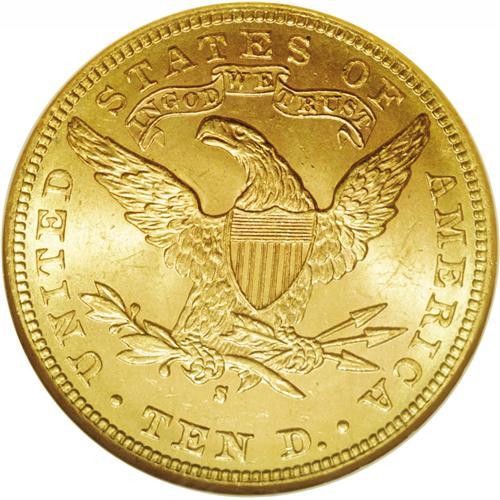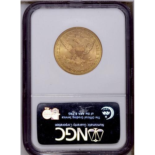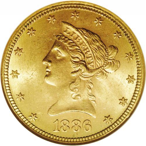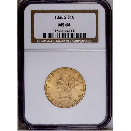 <B>1886-S<$10> MS64 NGC.</B></I> A lustrous and boldly impressed Liberty ten with a clean reverse and only moderate obverse grazes. The San Francisco Mint produced a sizeable majority of the half eagles, eagles, and double eagles struck between 1885 and 1889. However, the 1886-S becomes a significant condition rarity as a near-Gem. Census: 8 in 64, 0 finer (3/06). <BR><BR><B>Important notice:</B> Heritage usually auctions material at the rate of 200-250 lots per hour. On some occasions eBay Live bid software or the Internet may not be able to keep up with the pace of the auction. We recommend placing a realistic absentee bid now as insurance to avoid disappointment. Occasionally the auctioneer may eliminate or reject an eBay Live bid, and the auctioneer may also reopen a lot after the close of the eBay live bidding (usually because we missed an audience bid), and may reject your bid even if it shows you as the winning bidder. By bidding via eBay Live, you agree that Heritage may award the lot to another bidder at its sole discretion under the circumstances described above or any other reasonable circumstances. Since eBay bids are not shown to us until we open the lot on the floor, we treat those bids just like floor bids. In most cases the floor responds before the eBay bid is presented to us, due to Internet lag time, so for consistency we have made it a policy that floor bids are always considered first over tie eBay live bids. Also please note that all Heritage lots purchased through eBay Live carry a 20% Buyer's Premium. Please make sure you read the Terms and Conditions before you bid. This lot is being auctioned in conjunction with a live floor auction by Heritage Galleries & Auctioneers. All final auction and invoice information will be supplied by Heritage Galleries & Auctioneers, and all other information should be considered preliminary. Lot:4005 <BR><BR><B>Winning Notification and Billing:</B> After the FINAL session in this auction is complete, Heritage will send e-mail and snail mail invoices. This process normally takes several days. All final auction and invoice information will be supplied by Heritage Galleries & Auctioneers, and all other information should be considered preliminary. <BR><BR>This auction will be conducted on a live auction floor and over the Internet through eBay Live. If you choose to place an absentee bid, please take a moment to <font color='#0000ff'><u><a href='http://pages.ebay.com/liveauctions/help/before/laabsentee.html'>learn how eBay Live absentee bidding works</a></u></font><font color='#000000'>