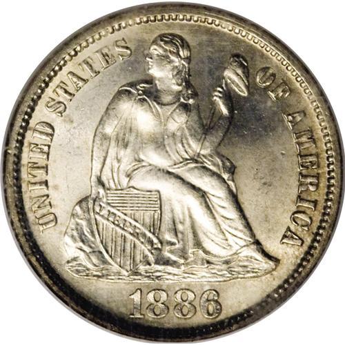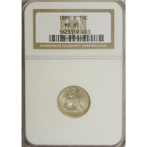<B>1886-S 10C MS65 NGC.</B></I> An awe-inspiring example of this difficult San Francisco dime issue; one that does not receive the attention of lower mintage issues such as the 1879-1881. Both sides offer sensational luster and are partially framed on the obverse in delicate golden patina. Census: 6 in 65, 16 finer (3/07).<BR><BR><b>Shipping:</b> Coins & Currency (<a target="_blank" href="http://www.heritageauctions.com/common/shipping.php">view shipping information</a>)