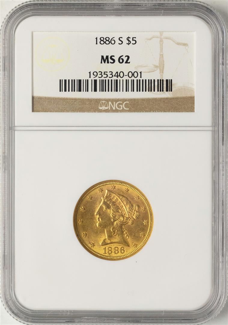 One 1886-S $5 Liberty Half Eagle Gold Coin NGC MS62. NGC Certified.