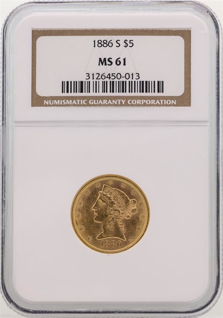 One 1886-S $5 Liberty Head Half Eagle Gold Coin NGC MS61. NGC Certified.