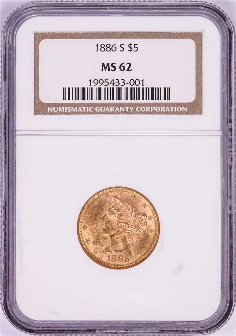 One 1886-S $5 Liberty Head Half Eagle Gold Coin NGC MS62. NGC Certified.
