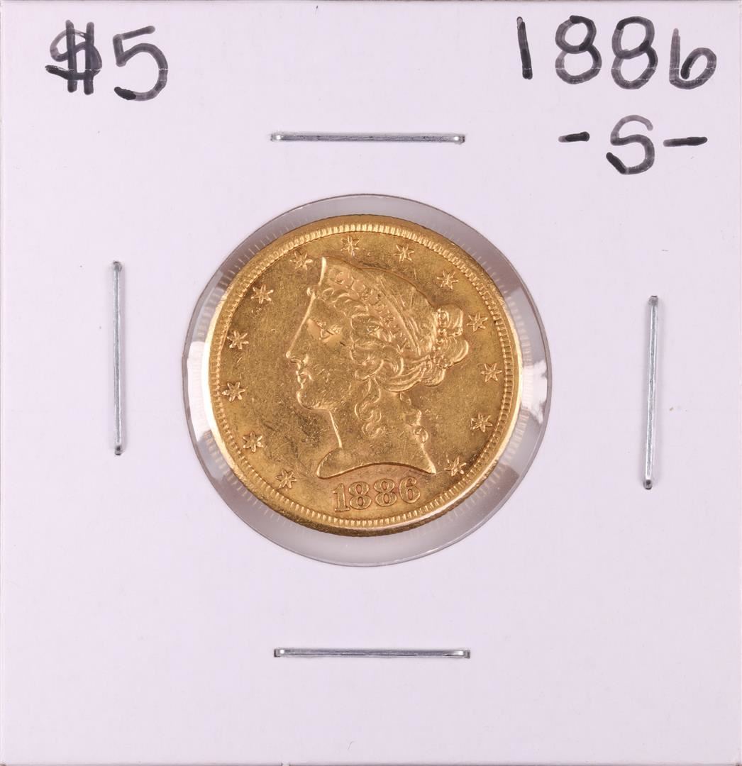 One 1886-S $5 Liberty Head Half Eagle Gold Coin.
