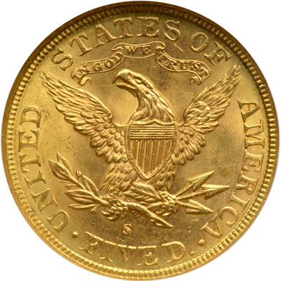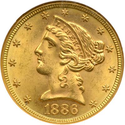 1886-S $5 Liberty. NGC graded MS-65. Lovely golden toning. Both sides are remarkably lustrous with beaming golden color and a spray of pinkish hue. In many ways, the strike is almost more important than the mint bloom. Sheer boldness of strike furnishes us something to crow about on this '86-S five, and something for bidders to approve of. Pop 48; 1 finer in 66 (PCGS # 8370) .