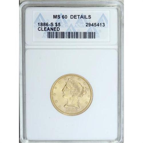 <B>1886-S $5 --Cleaned--ANACS. MS60 Details.</B></I> NGC Census: (271/4418). PCGS Population (282/2309). Mintage: 3,268,000. Numismedia Wsl. Price for NGC/PCGS coin in MS60: $225. (#8370)<BR><BR><B>Coin Engraver:</B> Christian Gobrecht<BR><BR><b>Shipping:</b> Coins & Currency (<a target="_blank" href="http://www.heritageauctions.com/common/shipping.php">view shipping information</a>\)