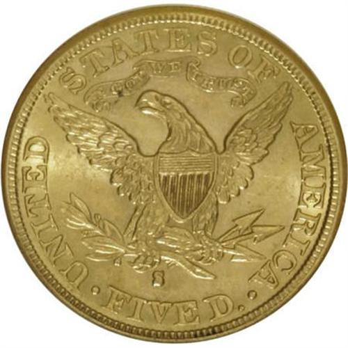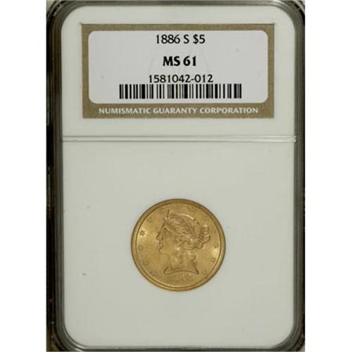 <B>1886-S $5 MS61 NGC.</B></I> NGC Census: (1390/3068). PCGS Population (563/1774). Mintage: 3,268,000. Numismedia Wsl. Price for NGC/PCGS coin in MS61: $295. (#8370)<BR><BR><B>Coin Engraver:</B> Christian Gobrecht<BR><BR><b>Shipping:</b> Coins & Currency (<a target="_blank" href="http://www.heritageauctions.com/common/shipping.php">view shipping information</a>)