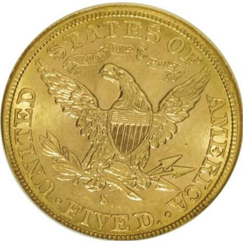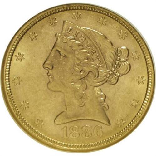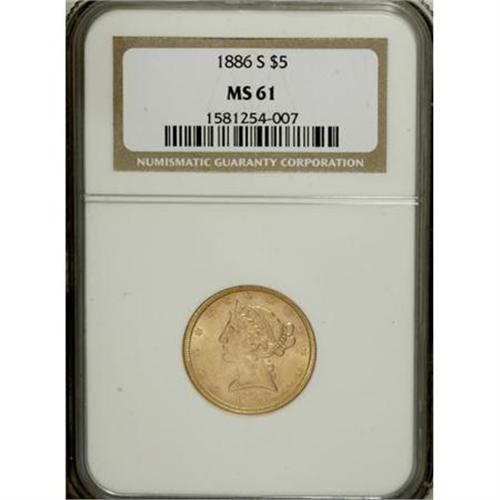 <B>1886-S $5 MS61 NGC.</B></I> NGC Census: (1416/3099). PCGS Population (568/1811). Mintage: 3,268,000. Numismedia Wsl. Price for NGC/PCGS coin in MS61: $295. (#8370)<BR><BR><B>Coin Engraver:</B> Christian Gobrecht<BR><BR><b>Shipping:</b> Coins & Currency (<a target="_blank" href="http://www.heritageauctions.com/common/shipping.php">view shipping information</a>)