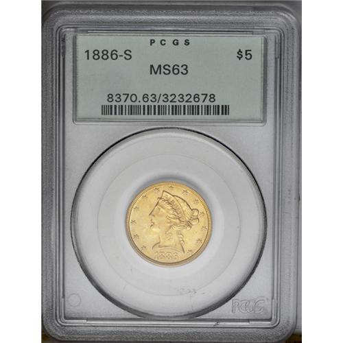 <B>1886-S<$5> MS63 PCGS.</B></I> A satiny and attentively struck olive-gold representative. Clean overall despite small marks on the jaw and near the arrowheads. Certified in a prior generation PCGS holder.