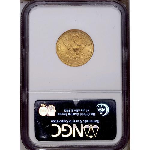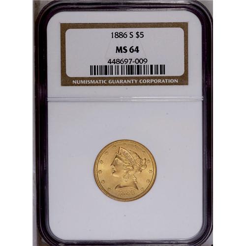 <B>1886-S<$5> MS64 NGC.</B></I> The unblemished surfaces of this crisply struck apricot-gold near-Gem ensure its eye appeal. An available issue, but most survivors are decidedly more abraded than the present example.