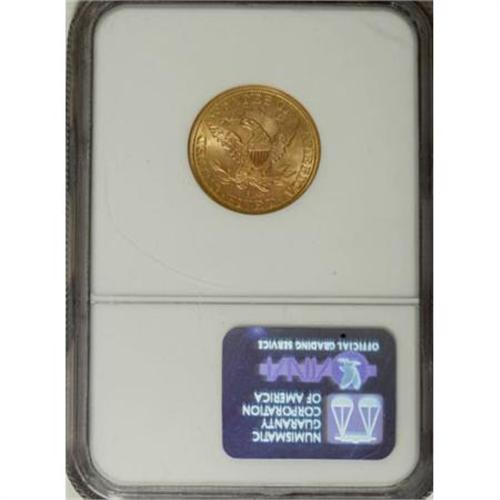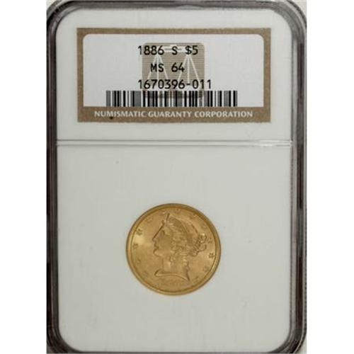 <B>1886-S $5 MS64 NGC.</B></I> A well struck and beautifully preserved near-Gem with sweeping luster and medium peach color. The mintmark is lightly repunched.<BR><BR><B>Coin Engraver:</B> Christian Gobrecht<BR><BR><b>Shipping:</b> Coins & Currency (<a target="_blank" href="http://www.heritageauctions.com/common/shipping.php">view shipping information</a>)