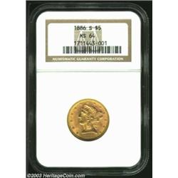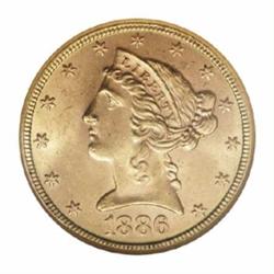 <TABLE cellSpacing=0 cellPadding=0 width="100%" bgColor=#000000 border=0><TBODY><TR><TD width="100%"><TABLE cellSpacing=1 cellPadding=3 width="100%" border=0><TBODY><TR><TD width="100%" bgColor=#79735c><FONT face=arial color=#ffffff size=3><B>Description</B> </FONT></TD></TR><TR><TD width="100%" bgColor=#ffffff><FONT face=arial size=2><B>1886-S $5 MS64 NGC.</B></I> The smooth, creamy mint luster of this near-Gem is barely interrupted by a few minute abrasions, all of which are well hidden by attractive orange-gold toning. Overall, there are no notable impairments to detract from the overall beauty of this sharply struck coin. </FONT></TD></TR></TBODY></TABLE></TD></TR></TBODY></TABLE><BR><A name=PricesRealized></A><TABLE cellSpacing=0 cellPadding=0 width="100%" bgColor=#000000 border=0><TBODY><TR><TD width="100%"><TABLE cellSpacing=1 cellPadding=3 width="100%" border=0><TBODY><TR><TD width="100%" bgColor=#79735c><A name=PR><FONT face=arial color=#ffffff size=3><B>Previous Prices from Heritage Auctions</B> </FONT></A></TD></TR><TR><TD bgColor=#f6f6ed><TABLE cellSpacing=0 cellPadding=0 width="100%" border=1><TBODY><TR><TD align=middle width="33%"><B>Date</B></TD><TD align=middle width="33%"><B>Service</B></TD><TD align=middle width="33%"><B>Price</B></TD></TR><TR bgColor=whitesmoke><TD width="33%"><B>08/13/1996</B></TD><TD width="33%">NGC</TD><TD width="33%">$1,375.00</TD></TR><TR bgColor=whitesmoke><TD width="33%"><B>03/12/2002</B></TD><TD width="33%">PCGS</TD><TD width="33%">$891.25</TD></TR><TR bgColor=whitesmoke><TD width="33%"><B>09/09/1994</B></TD><TD width="33%">PCGS</TD><TD width="33%">$1,760.00</TD></TR><TR bgColor=whitesmoke><TD width="33%"><B>02/01/1999</B></TD><TD width="33%">PCGS</TD><TD width="33%">$1,265.00</TD></TR><TR bgColor=whitesmoke><TD width="33%"><B>11/25/2002</B></TD><TD width="33%">NGC</TD><TD width="33%">$632.50</TD></TR><TR bgColor=whitesmoke><TD width="33%"><B>06/08/2002</B></TD><TD width="33%">NGC</TD><TD width="33%">$805.00</TD></TR><TR bgColor=whitesmoke><TD width="33%"><B>05/31/2001</B></TD><TD width="33%">NGC</TD><TD width="33%">$885.50</TD></TR><TR bgColor=whitesmoke><TD width="33%"><B>09/28/2002</B></TD><TD width="33%">PCGS</TD><TD width="33%">$920.00</TD></TR><TR bgColor=whitesmoke><TD width="33%"><B>05/06/2000</B></TD><TD width="33%">NGC</TD><TD width="33%">$776.25</TD></TR></TBODY></TABLE></TD></TR><TR><TD bgColor=#ffffff><FONT face=arial size=1 ?>PLEASE NOTE: All prices realized reflect the final hammer price PLUS the buyer's premium in auctions that charge a buyer's premium. Each item has a notation at the top of the listing indicating whether that lot included a buyer's premium. Example: A item that sells with a final hammer price of $100 and a 20% buyer's premium will display with a price realized of $120. All information listed is intended to be as accurate as possible, but errors are possible. Please use this guide carefully and inform us of any inaccuracies. </FONT></TD></TR></TBODY></TABLE></TD></TR></TBODY></TABLE><BR><TABLE cellSpacing=0 cellPadding=0 width="100%" bgColor=#000000 border=0><TBODY><TR><TD width="100%"><TABLE cellSpacing=1 cellPadding=3 width="100%" border=0><TBODY><TR><TD width="100%" bgColor=#79735c colSpan=6><FONT face=arial color=#ffffff size=3><B>Price Guide*</B> </FONT></TD></TR><TR bgColor=#f6f6ed><TD align=middle><B>Grade</B> </TD><TD align=middle><B>Coin World<BR>(Trends)</B> </TD><TD align=middle><B>Numismedia<BR>Retail</B> </TD><TD align=middle><B>Numismedia<BR>Wholesale</B> </TD><TD align=middle><B>Coin<BR>Universe</B> </TD><TD align=middle><B>Heritage<BR>Value Index</B> </TD></TR><TR bgColor=#ffffff><TD align=middle>63</TD><TD align=right>$775.00</TD><TD align=right>$780.00</TD><TD align=right>$625.00</TD><TD align=right>$650.00</TD><TD align=right>$512.00</TD></TR><TR style="FONT-WEIGHT: bold" bgColor=#cccfdd><TD align=middle>64</TD><TD align=right>$2,050.00</TD><TD align=right>---</TD><TD align=right>$1,025.00</TD><TD align=right>$1,850.00</TD><TD align=right>$1,070.00</TD></TR><TR bgColor=#ffffff><TD align=middle>65</TD><TD align=right>---</TD><TD align=right>---</TD><TD align=right>$3,150.00</TD><TD align=right>$5,075.00</TD><TD align=right>$2,784.17</TD></TR><TR bgColor=#ffffff><TD colSpan=6><FONT size=1>*All information listed is intended to be as accurate as possible, but errors are possible. No item may be returned or refused based on this information which is provided as a service to our customers. You should contact each pricing source directly to determine the accuracy of this information. </FONT></TD></TR></TBODY></TABLE></TD></TR></TBODY></TABLE><BR><TABLE cellSpacing=0 cellPadding=0 width="100%" bgColor=#000000 border=0><TBODY><TR><TD width="100%"><TABLE cellSpacing=1 cellPadding=3 width="100%" border=0><TBODY><TR><TD width="100%" bgColor=#79735c><FONT face=arial color=#ffffff size=3><B>Population Guide</B> </FONT></TD></TR><TR bgColor=#ffffff><TD align=middle><!-- Begin Output of Population Grid--><TABLE cellSpacing=0 cellPadding=0 width="100%" border=0><TBODY><TR><TD vAlign=center><TABLE cellSpacing=0 width="100%" border=1 cellsadding="3"><TBODY><TR><TD vAlign=center><TABLE cellSpacing=0 cellPadding=3 width="100%" border=1><TBODY><TR><TD vAlign=center align=middle bgColor=#f0f1e8 colSpan=2 <CENTER><FONT face=Arial size=2><B>PCGS Pop </B></FONT><CENTER></CENTER></TD><TD vAlign=center align=middle bgColor=#f0f1e8 colSpan=2><CENTER><FONT face=Arial size=2><B>NGC Pop</B></CENTER></FONT></TD></TR><TR><TD vAlign=center><FONT face=Arial size=2>(64)</FONT> </TD><TD vAlign=center align=right><FONT face=Arial size=2>120</FONT> </TD><TD vAlign=center><FONT face=Arial size=2>(64)</FONT> </TD><TD vAlign=center align=right><FONT face=Arial size=2>185</FONT> </TD></TR><TR><TD vAlign=center><FONT face=Arial size=2>(>64)</FONT> </TD><TD vAlign=center align=right><FONT face=Arial size=2>3</FONT> </TD><TD vAlign=center><FONT face=Arial size=2>(>64)</FONT> </TD><TD vAlign=center align=right><FONT face=Arial size=2>40</F