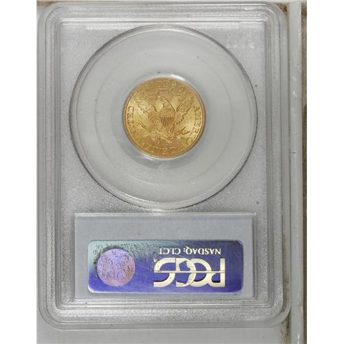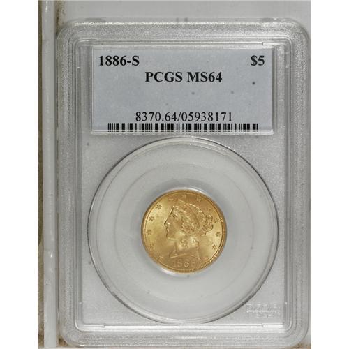 <B>1886-S $5 MS64 PCGS.</B></I> One of the highest mintages of the Liberty Head series (3.268 million pieces). Straw-gold surfaces impinged with traces of lime green reveal a few minor marks<BR><BR><b>Shipping:</b> Coins & Currency (<a target="_blank" href="http://www.heritageauctions.com/common/shipping.php">view shipping information</a>)