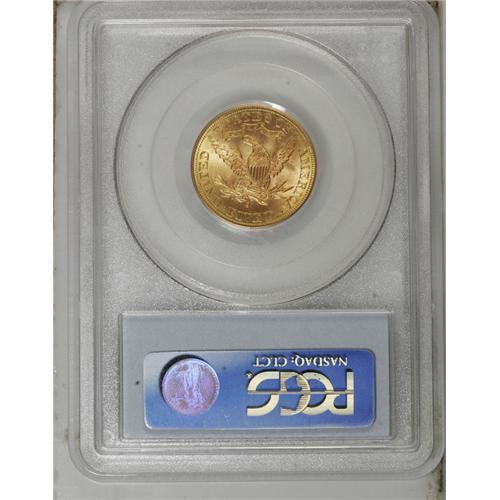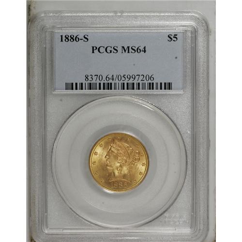 <B>1886-S $5 MS64 PCGS.</B></I> Predominantly yellow-gold with hints of peach and emerald. A number of small marks are noted in the obverse fields and on the cheek. PCGS has certified a mere six pieces finer (10/06).<BR><BR><b>Shipping:</b> Coin/Currency (<a target="_blank" href="http://www.heritageauctions.com/common/shipping.php">view shipping information</a>)