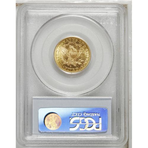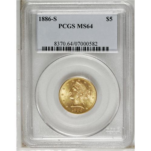 <B>1886-S<$5> MS64 PCGS.</B></I> This is an important date that is seldom encountered so fine, and rarely any better. PCGS has only certified five finer examples. The surfaces have light abrasions that are consistent with the grade. Both sides are fully lustrous with frosty yellow-gold surfaces. Hints of pink color are evident on the obverse and olive on the reverse.