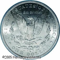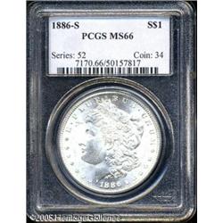 <B>1886-S<img border='0' src='http://www.heritagecoins.com/images/star.gif' width=10 height=10>$1 MS66 PCGS.</B></I> VAM-2. A Top 100 Variety. Reasonably available in Select condition, the 1886-S becomes scarce in MS64 and is a rarity above MS65. This brilliant and crisply struck premium Gem has an immaculate reverse, while the obverse possesses only inoffensive faint marks. The mintmark was initially entered with a pronounced tilt to the right, then largely effaced and repunched at the proper angle. The serifs from the initial punch remain evident. Population: 29 in 66, 4 finer (1/05). Lot:10242