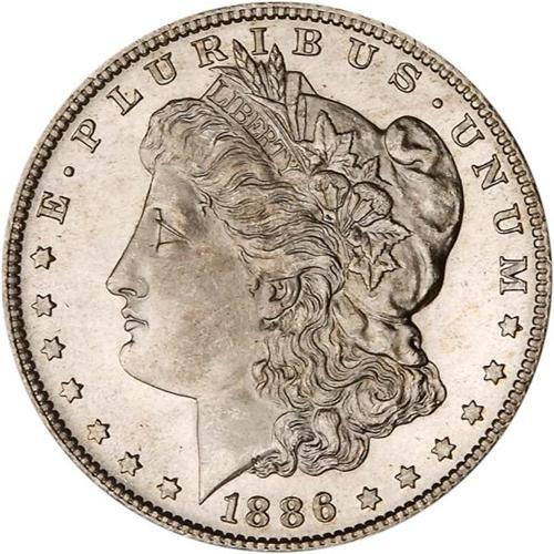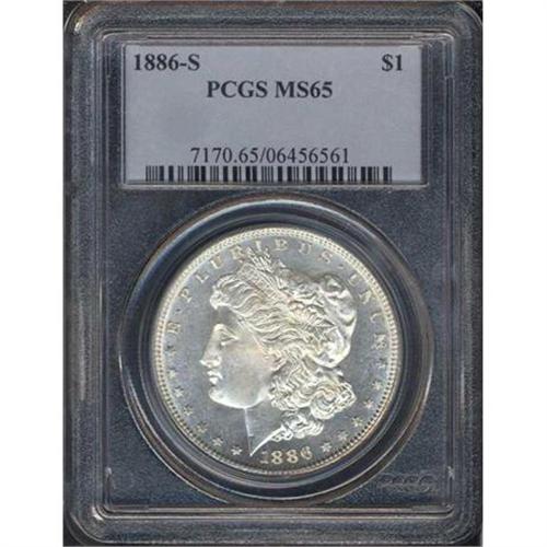 <b>1886-S Morgan Dollar. PCGS graded MS65.</b> What is most noticeable when one first examines this low mintage coin is its thick mint luster -- it swirls from side-to-side unimpeded by noticeable abrasions and unscathed by even a hint of color. A coin of singular beauty and importance to the collector given the under-1 million mintage of 750,000 pieces. The proper amount of strike pressure was used, the coin is fully brought up by the dies. We see no reason to add in a "however" here, since there are no soft areas as are sometimes found on this date, none at all! <b>(PCGS # 7170)</b>