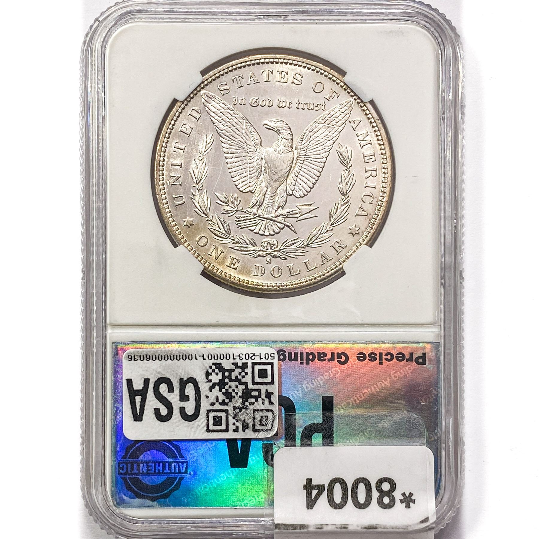 COINS AND CURRENCY LISTED IN GSA’S CATALOG AS GRADED AND ENCAPSULATED BY PCGS, NGC, ANACS, ICG, PCGS CURRENCY, PMG, PCGS BANKNOTE GRADING, CMC OR ANY OTHER THIRD-PARTY GRADING SERVICE ARE LIKEWISE SOLD “AS-IS” EXCEPT AS EXPRESSLY SET FORTH HEREIN. ALL THIRD-PARTY GRADING SERVICE GUARANTEES, INCLUDING AUTHENTICITY, ARE THE SOLE RESPONSIBILITY OF THE THIRD-PARTY GRADING SERVICE AND NOT WARRANTIES OR GUARANTEES OF GSA. BIDDERS SHOULD CONTACT THESE THIRD-PARTY GRADING SERVICES DIRECTLY WITH RESPECT TO ANY CLAIMS OR QUESTIONS THEY MAY HAVE CONCERNING THEIR GUARANTEES AND WARRANTIES. BIDDERS ACKNOWLEDGE AND AGREE THAT AUCTIONEER IS NOT BOUND BY OR LIABLE FOR ANY OPINION OR CERTIFICATION BY ANY THIRD-PARTY GRADING SERVICE. REMOVAL OF A PRODUCT FROM ITS PROTECTIVE CASING OR HOLDER OR ALTERATION OF ANY COIN HOLDER WAIVES ALL RIGHTS CONCERNING THE PRODUCT CONTAINED THEREIN.