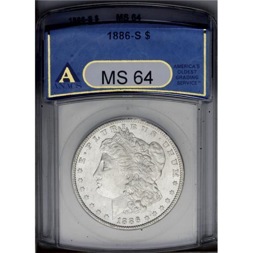 <B>1886-S<img border='0' src='http://www.heritagecoins.com/images/star.gif' width=10 height=10>$1> MS64 ANACS.</B></I> Silver-gray surfaces display nice field to design contrast, and the motifs are nicely brought up. The grade is defined by several luster grazes on Liberty's cheek and neck. <BR><BR><B>Important notice:</B> Heritage usually auctions material at the rate of 200-250 lots per hour. On some occasions eBay Live bid software or the Internet may not be able to keep up with the pace of the auction. We recommend placing a realistic absentee bid now as insurance to avoid disappointment. Occasionally the auctioneer may eliminate or reject an eBay Live bid, and the auctioneer may also reopen a lot after the close of the eBay live bidding (usually because we missed an audience bid), and may reject your bid even if it shows you as the winning bidder. By bidding via eBay Live, you agree that Heritage may award the lot to another bidder at its sole discretion under the circumstances described above or any other reasonable circumstances. Since eBay bids are not shown to us until we open the lot on the floor, we treat those bids just like floor bids. In most cases the floor responds before the eBay bid is presented to us, due to Internet lag time, so for consistency we have made it a policy that floor bids are always considered first over tie eBay live bids. Also please note that all Heritage lots purchased through eBay Live carry a 20% Buyer's Premium. Please make sure you read the Terms and Conditions before you bid. This lot is being auctioned in conjunction with a live floor auction by Heritage Galleries & Auctioneers. All final auction and invoice information will be supplied by Heritage Galleries & Auctioneers, and all other information should be considered preliminary. Lot:3462 <BR><BR><B>Winning Notification and Billing:</B> After the FINAL session in this auction is complete, Heritage will send e-mail and snail mail invoices. This process normally takes several days. All final auction and invoice information will be supplied by Heritage Galleries & Auctioneers, and all other information should be considered preliminary. <BR><BR>This auction will be conducted on a live auction floor and over the Internet through eBay Live. If you choose to place an absentee bid, please take a moment to <font color='#0000ff'><u><a href='http://pages.ebay.com/liveauctions/help/before/laabsentee.html'>learn how eBay Live absentee bidding works</a></u></font><font color='#000000'>