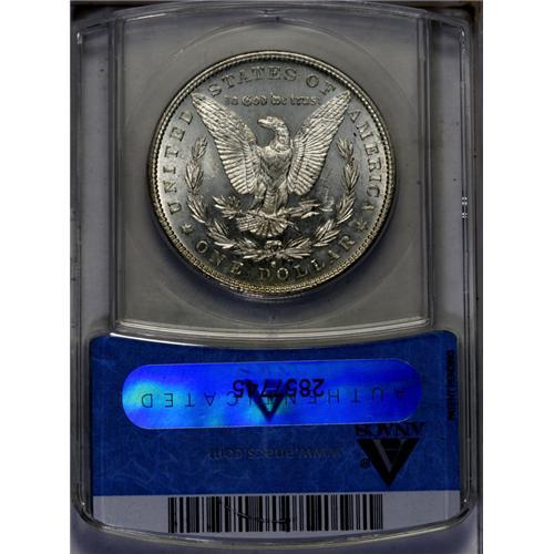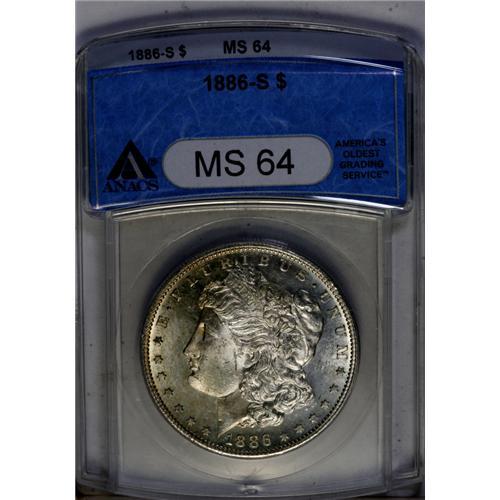 <B>1886-S<img border='0' src='http://www.heritagecoins.com/images/star.gif' width=10 height=10>$1> MS64 ANACS.</B></I> This shimmering better date dollar is mostly untoned, but has a blush of gold and ice-blue toning across the left obverse field. There are no individually distracting marks.