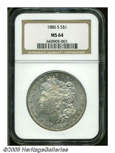 <B>1886-S<S$1> MS64 NGC.</B></I> Attractive example with variegated rich-golden color over the lustrous silver surfaces. Light wispy marks are seen across the surfaces, as typical, but these are all very minor for a near-Gem coin.