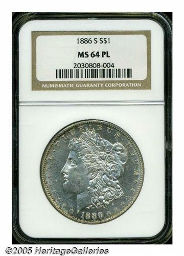 <B>1886-S<S$1> MS64 Prooflike NGC.</B></I> The flashy surfaces show the merest suggestion of light patina on each side. The fields are well mirrored and each side is perfectly balanced. Very few abrasions interrupt the brightness of this impressive coin. Very scarce as a Prooflike near-Gem.