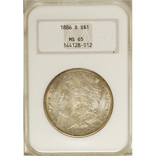 <B>1886-S S$1 MS65 NGC.</B></I> Partially reflective with dappled gold and gray surfaces. Remarkably clean for this issue with only one tiny abrasion, a small milling mark at the back of the neck that is almost in the hair. An outstanding example of this popular and conditionally challenging dollar.<BR><BR><b>Shipping:</b> Coin/Currency (<a target="_blank" href="http://www.heritageauctions.com/common/shipping.php">view shipping information</a>)