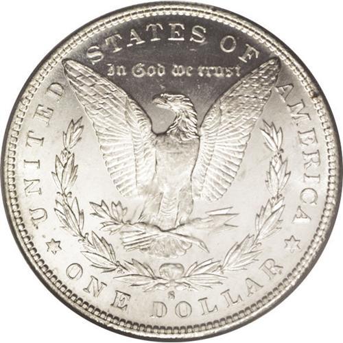 <B>1886-S<img border='0' src='http://www.heritagecoins.com/images/star.gif' width=10 height=10>$1> MS65 PCGS.</B></I> An incredible Gem with full, glowing luster and nearly fully prooflike surfaces that display virtually no contact marks, save for one lateral abrasion on the eagle's breast. Mostly brilliant; some mottled opaque-brown hues are noted on the obverse. A premium coin and clearly superior for the grade.<BR><I>From The Chicago-Ark Collection.</B></I>