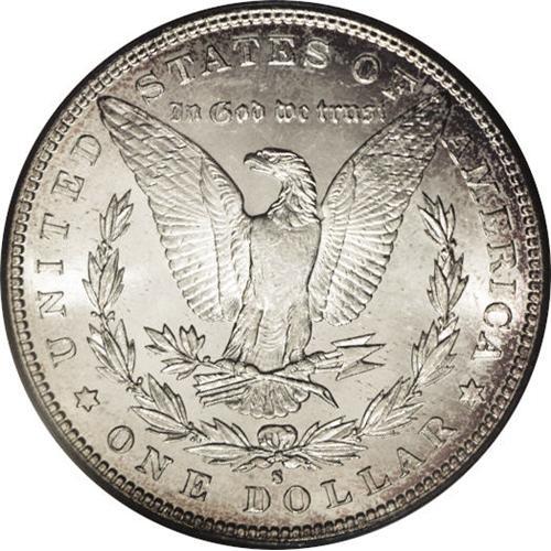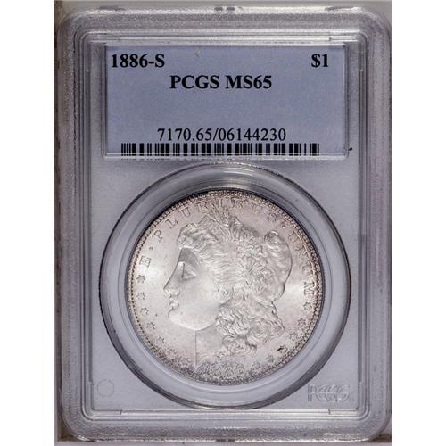 <B>1886-S<img border='0' src='http://www.heritagecoins.com/images/star.gif' width=10 height=10>$1> MS65 PCGS.</B></I> VAM-2. A Top 100 Variety. The mintmark is repunched near the serifs. The surfaces of this bright Gem display scintillating mint luster and attractive heather toning near the obverse and reverse peripheries. Only a handful of trivial marks are seen overall. Well struck, and clearly finer than the vast majority of this low-mintage issue. <BR><BR><B>Important notice:</B> Heritage usually auctions material at the rate of 200-250 lots per hour. On some occasions eBay Live bid software or the Internet may not be able to keep up with the pace of the auction. We recommend placing a realistic absentee bid now as insurance to avoid disappointment. Occasionally the auctioneer may eliminate or reject an eBay Live bid, and the auctioneer may also reopen a lot after the close of the eBay live bidding (usually because we missed an audience bid), and may reject your bid even if it shows you as the winning bidder. By bidding via eBay Live, you agree that Heritage may award the lot to another bidder at its sole discretion under the circumstances described above or any other reasonable circumstances. Since eBay bids are not shown to us until we open the lot on the floor, we treat those bids just like floor bids. In most cases the floor responds before the eBay bid is presented to us, due to Internet lag time, so for consistency we have made it a policy that floor bids are always considered first over tie eBay live bids. Also please note that all Heritage lots purchased through eBay Live carry a 20% Buyer's Premium. Please make sure you read the Terms and Conditions before you bid. This lot is being auctioned in conjunction with a live floor auction by Heritage Galleries & Auctioneers. All final auction and invoice information will be supplied by Heritage Galleries & Auctioneers, and all other information should be considered preliminary. Lot:3466 <BR><BR><B>Winning Notification and Billing:</B> After the FINAL session in this auction is complete, Heritage will send e-mail and snail mail invoices. This process normally takes several days. All final auction and invoice information will be supplied by Heritage Galleries & Auctioneers, and all other information should be considered preliminary. <BR><BR>This auction will be conducted on a live auction floor and over the Internet through eBay Live. If you choose to place an absentee bid, please take a moment to <font color='#0000ff'><u><a href='http://pages.ebay.com/liveauctions/help/before/laabsentee.html'>learn how eBay Live absentee bidding works</a></u></font><font color='#000000'>