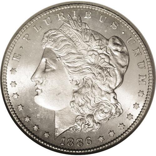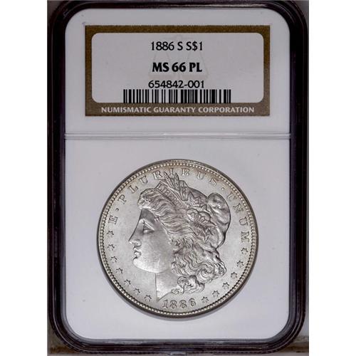 <B>1886-S<img border='0' src='http://www.heritagecoins.com/images/star.gif' width=10 height=10>$1> MS66 Prooflike NGC.</B></I> This stunning coin simply could not have been a part of the Redfield Hoard. Liberty's cheek is smooth and rounded with virtually no abrasions. The fields are brightly mirrored and light frost is seen on the devices. Simply outstanding quality and brilliant throughout. Census: 1 in 66 Prooflike, none finer (3/06).