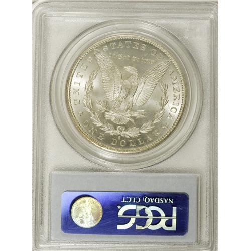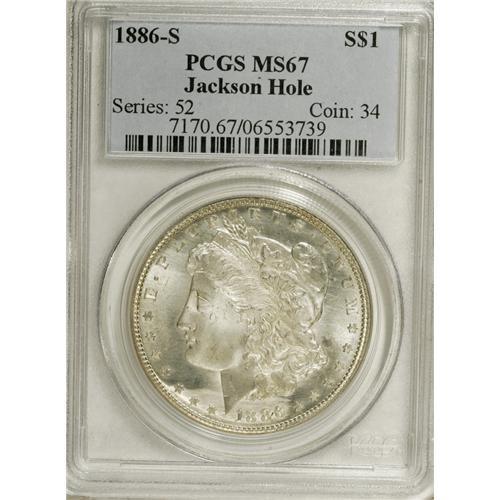<B>1886-S S$1 MS67 PCGS.</B></I> Ex: Jackson Hole. While the 1886-S is not exactly a rare issue in the lower grades of Uncirculated, better grade (MS65 and finer) examples are scarce and always in demand by serious Morgan dollar collectors. This is tied with one other as the finest 1886-S dollar we have ever handled. Everything has come together on this one coin. The surfaces are extraordinarily clean; in fact, they are as close to perfect as any '86-S we have ever seen. Each side presents a brilliant, essentially untoned appearance with a semi-prooflike finish in the fields that many would call full Prooflike. As a future identifier, an area of heavy die polish is seen at the base of the obverse across the date, creating a slightly dull impression. Also, a tiny black spot is seen between the 8 and 6 of the date. Population: 4 in 67, 0 finer (2/07).<BR><I>From The Jackson Hole Collection.</B></I><BR><BR><b>Shipping:</b> Coins & Currency (<a target="_blank" href="http://www.heritageauctions.com/common/shipping.php">view shipping information</a>)