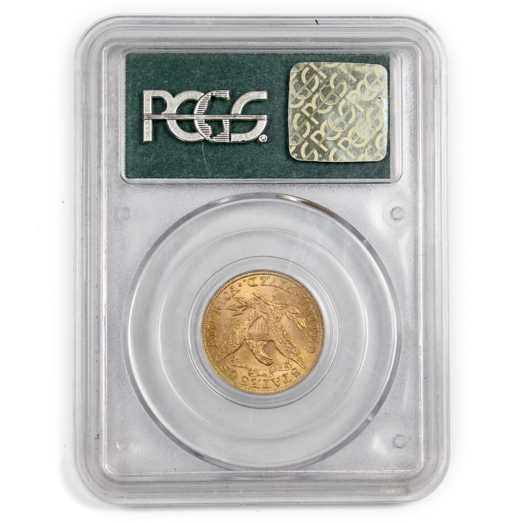 1886-S USA $5.00 Gold Half Eagle, PCGS Certified, 22K Gold Coin in MS-60 Condition. Vibrant copper tones! Comes in PCGS protective capsule.