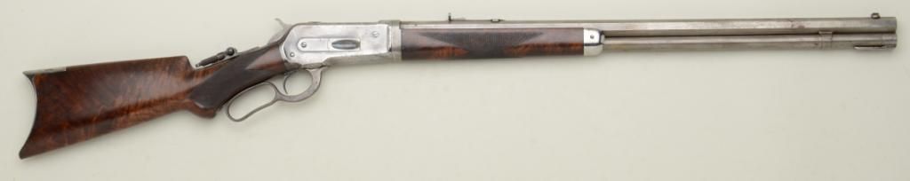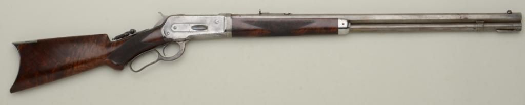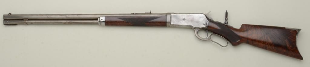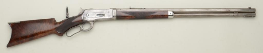 1886 Special Order Deluxe rifle with 26" full octagon barrel, takedown frame, full magazine, 3X checkered pistol grip stock, crescent butt plate, Lyman tang sight, in .40-82 cal., serial #95901. The barrel andmagazine tube have been lightly cleaned to a gray patina with good barrel address and fairly sharp edges. The forend cap and takedown collar have also been cleaned and lightly polished, the forend cap shows somepitting. The frame is a mottled gray with some minor pitting. The hammer and lever show traces of case hardening, the loading gate shows a trace of blue. The stocks have been lightly refinished and checkeringlightly retraced; the butt plate has been polished, shows some pitting, there is a slightly newer sight in the rear dovetail and correct front dovetail. The inlay and pistol grip is an old replacement. Theaction good, the bore fair to good. Est.: $3,000-$6,000