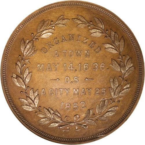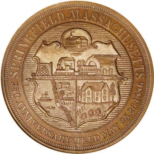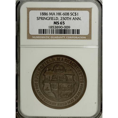 <B>1886 Springfield MA 250th Anniversary MS65 Brown NGC.</B></I> HK-608, "rare." A beautiful chocolate-brown Gem with good field reflectivity and a penetrating strike. There is no indication of carbon or contact, and the sole imperfection is a faint fingerprint fragment above CITY. The only example certified by NGC, as of (12/06).<BR><BR><b>Shipping:</b> Coins & Currency (<a target="_blank" href="http://www.heritageauctions.com/common/shipping.php">view shipping information</a>)