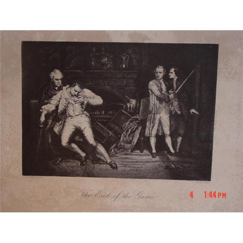 This is an 1886(?) steel engraving from the publisher George Barrie collection by S. J. Ferris of "The End of the Game" from the painting by J. B. Irving. The size of the paper is 17" x 11.75" and the picture is 8.25" x 5.75". The paper has discolored with age, and there is some tearing at the top right.
