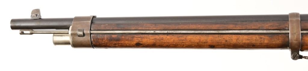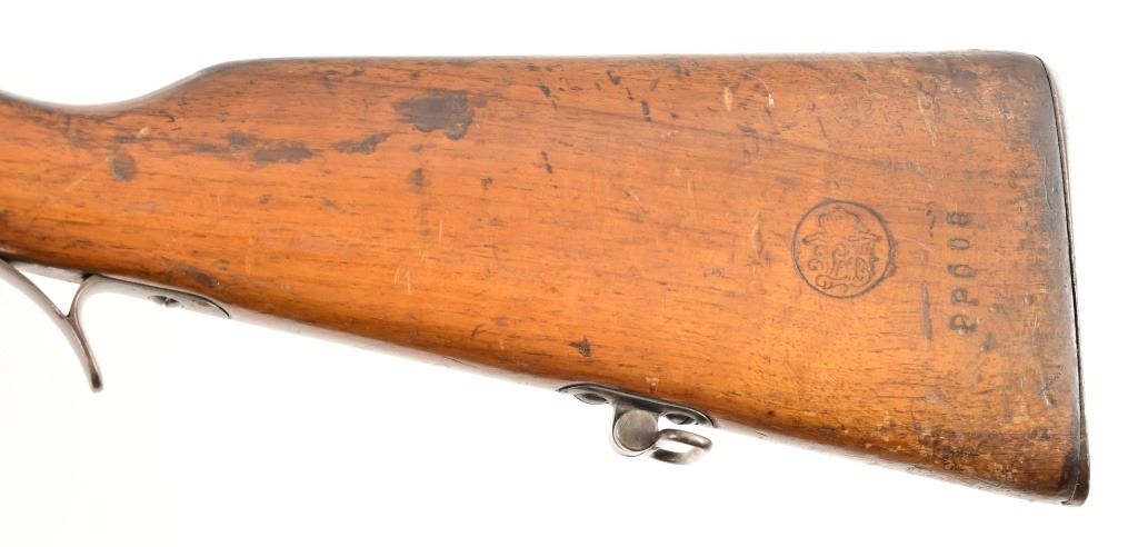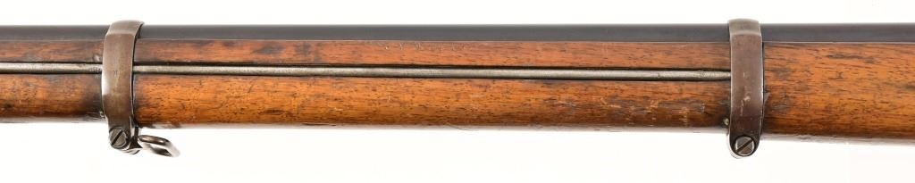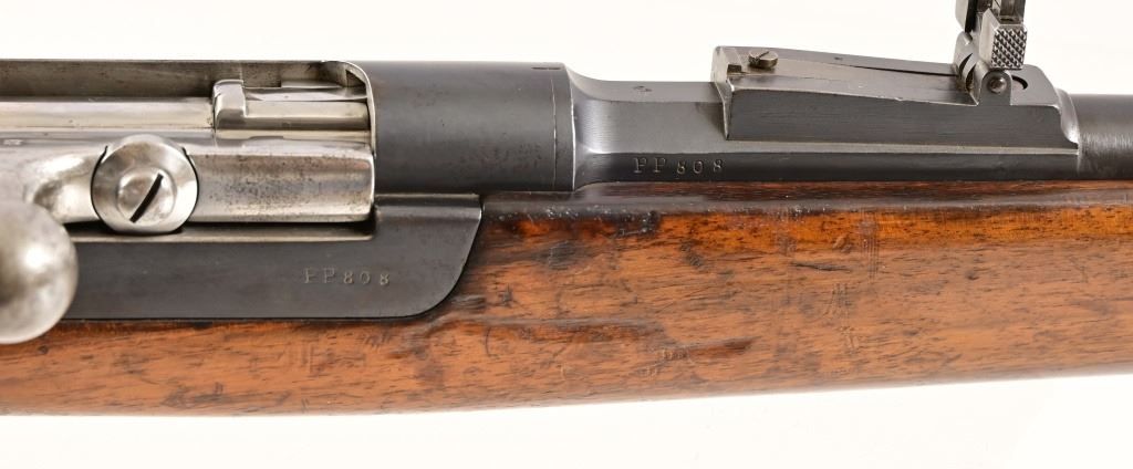 SN PP808. 32.5" barrel, bore is dark. Working action, solid wood with faint cartouche. High degree of bluing on metal, likely refurbished at some point. Antique.