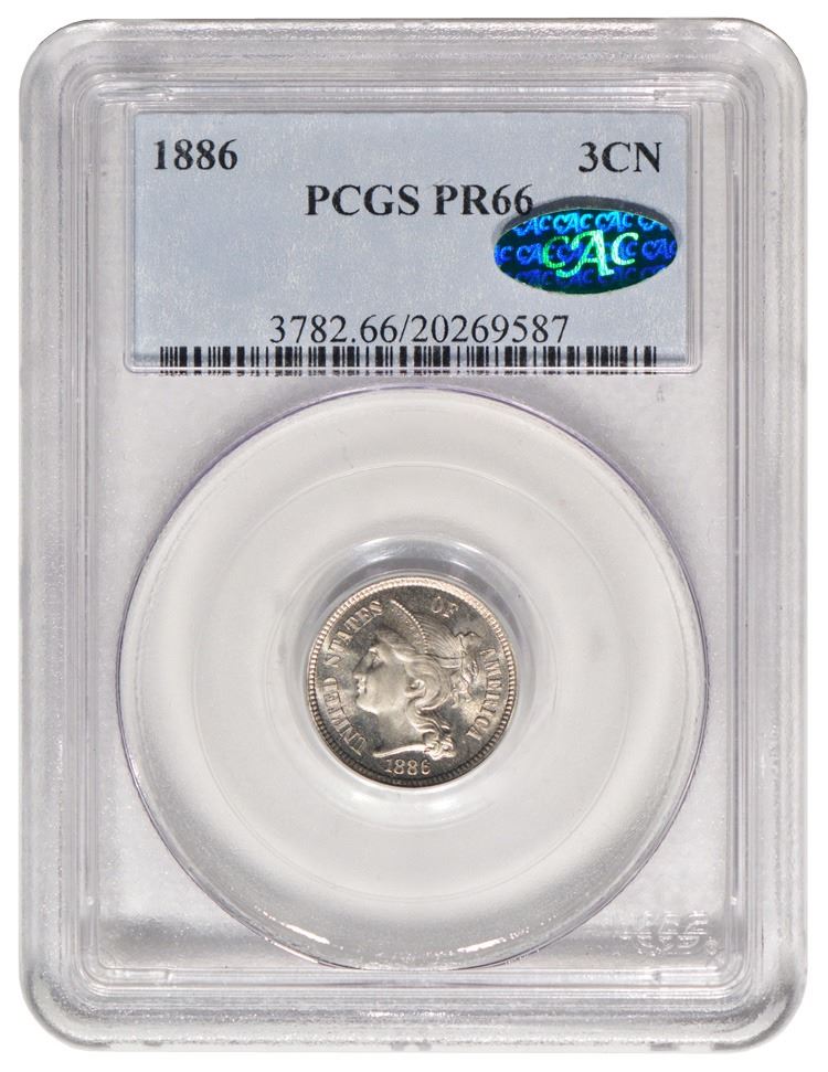 One 1886 Three Cent Nickel PCGS PR66 CAC.