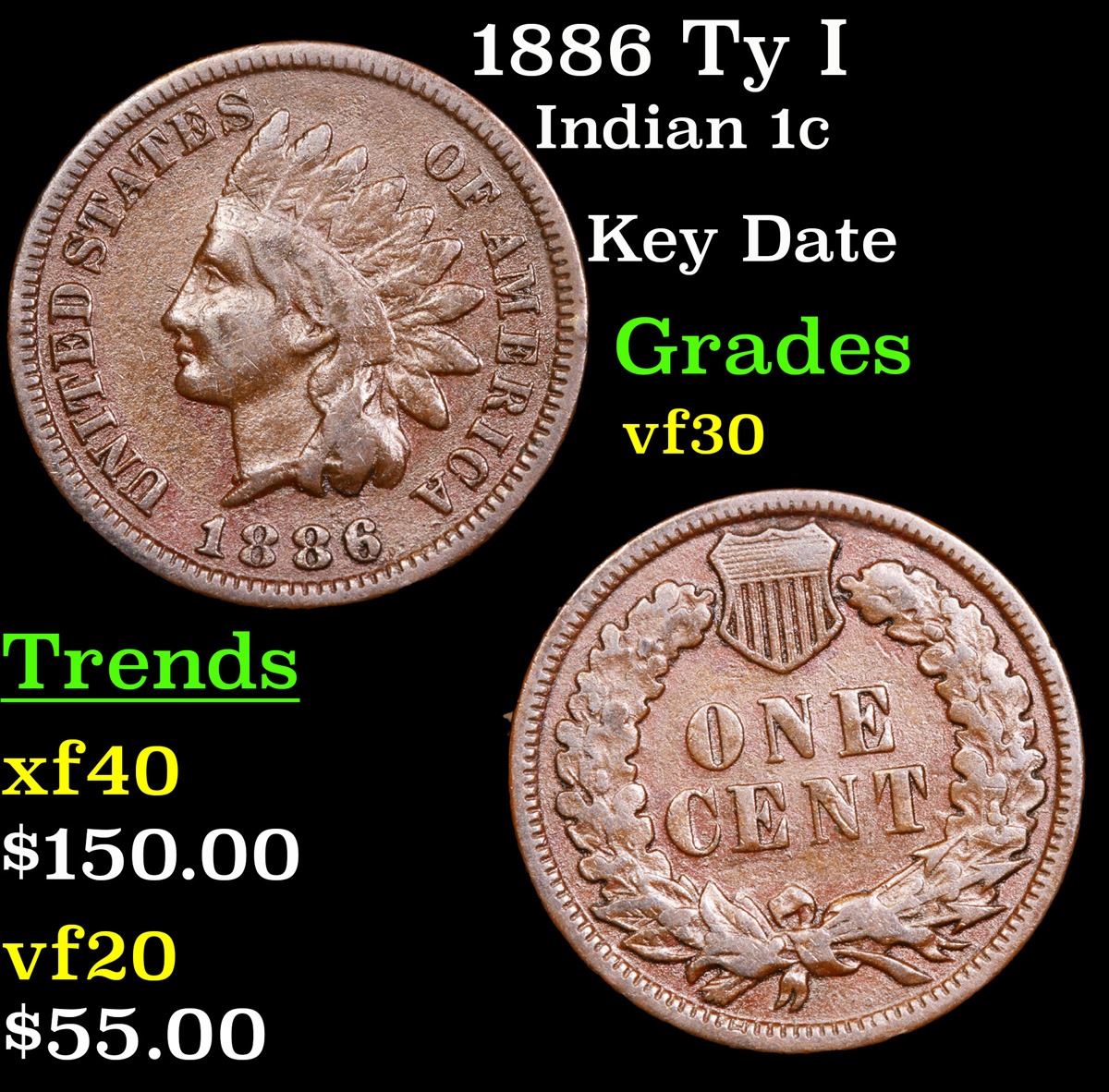 1886 Ty I Key Date . Indian Cent 1c Grades vf++.