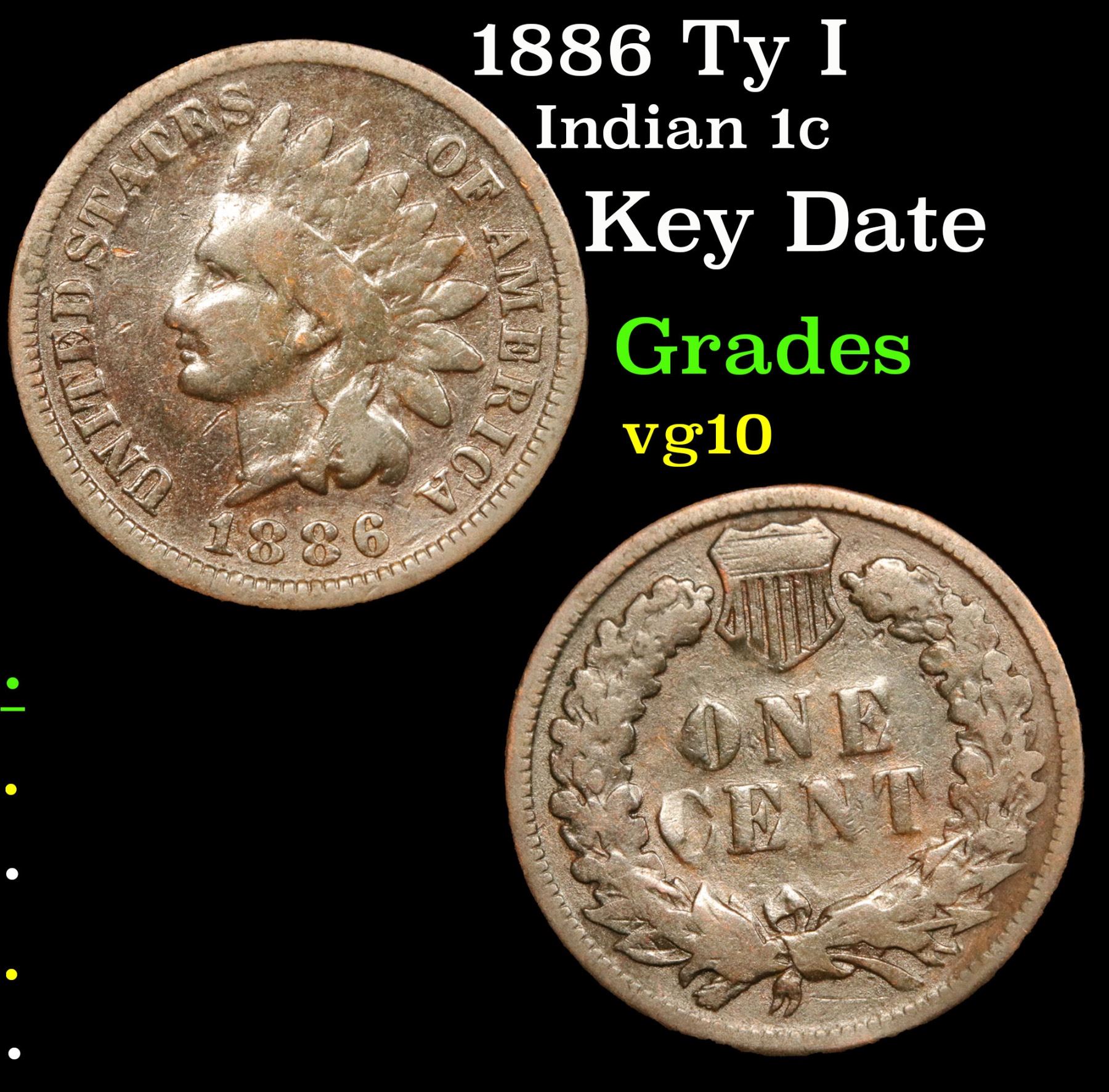 1886 Ty I Indian Cent 1c Grades vg+. Key Date