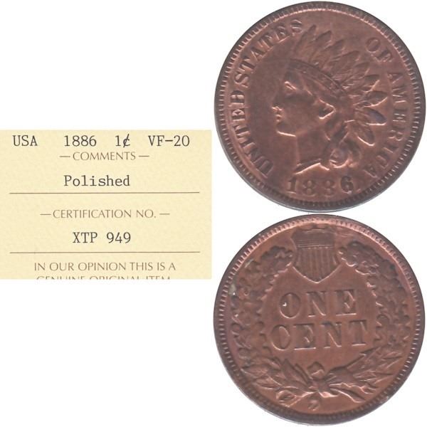 1886 USA 1-cent ICCS Certified VF-20 (Polished)