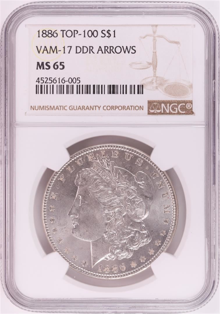 One 1886 VAM-17 DDR Arrows $1 Morgan Silver Dollar Coin NGC MS65 Top-100. NGC Certified.