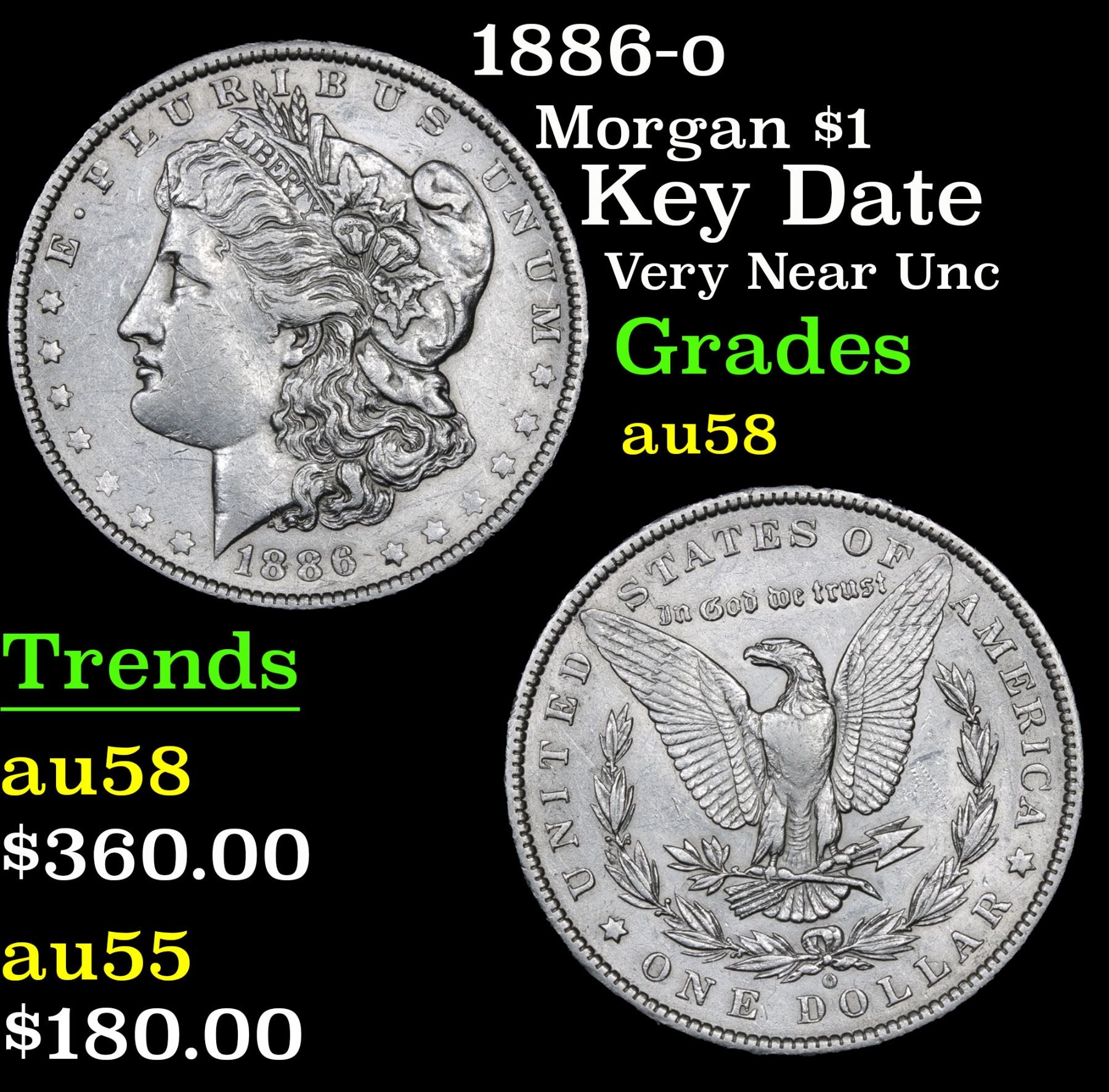 1886-o Morgan Dollar $1 Grades Choice AU/BU Slider. Key Date Very Near Unc