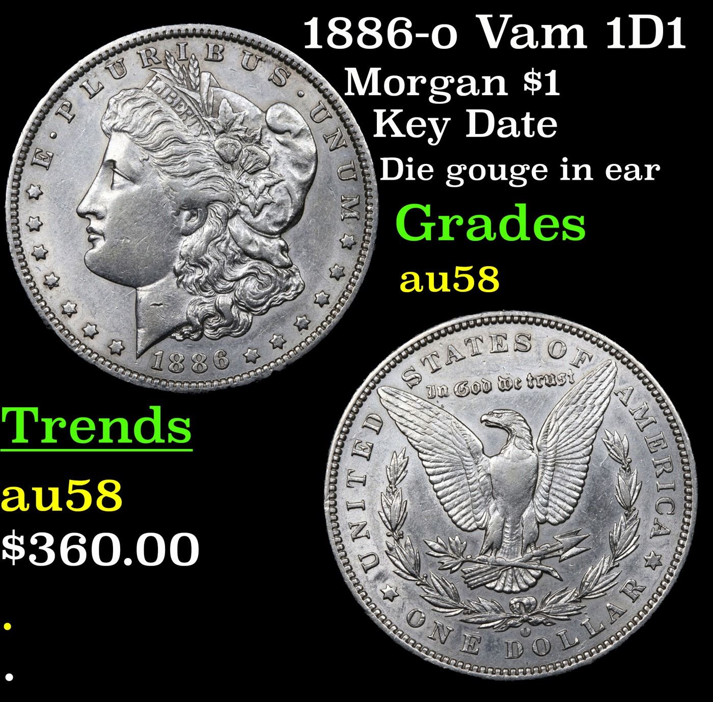 1886-o Vam 1D1 Morgan Dollar $1 Grades Choice AU/BU Slider.