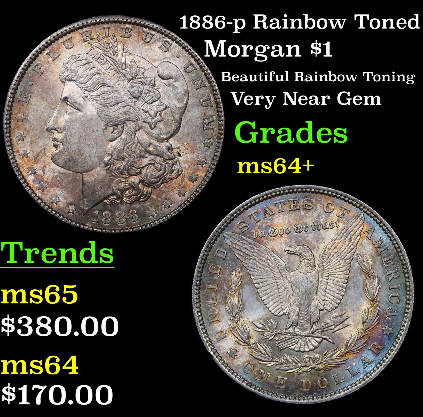 1886-p Rainbow Toned Morgan Dollar $1 Grades Choice+ Unc.