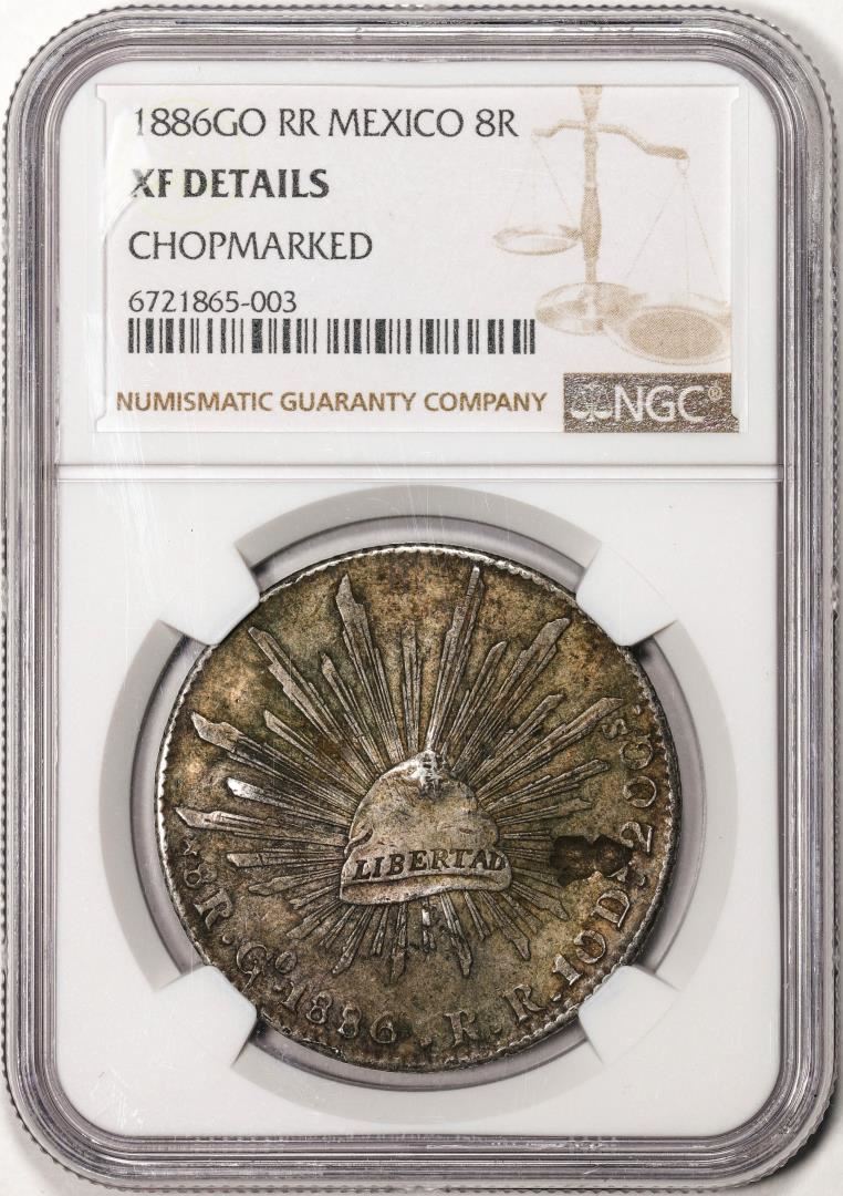 One 1886GO RR Mexico 8 Reales Silver Coin NGC XF Details Chopmarked. NGC Certified.