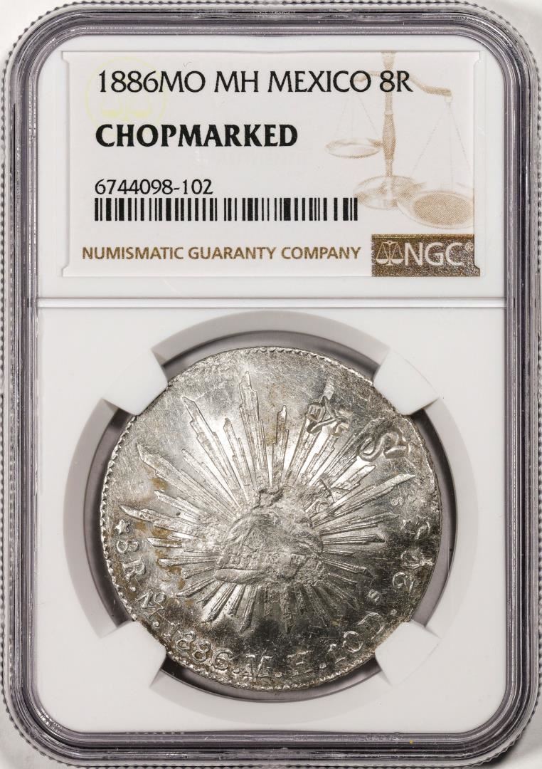 One 1886MO MH Mexico 8 Reales Silver Coin NGC Chopmarked. NGC Certified.