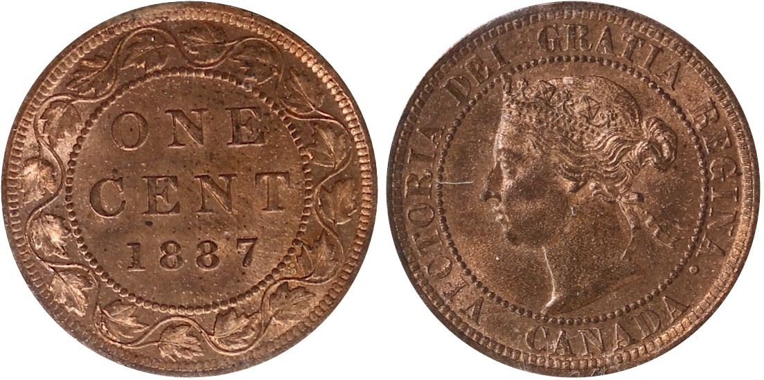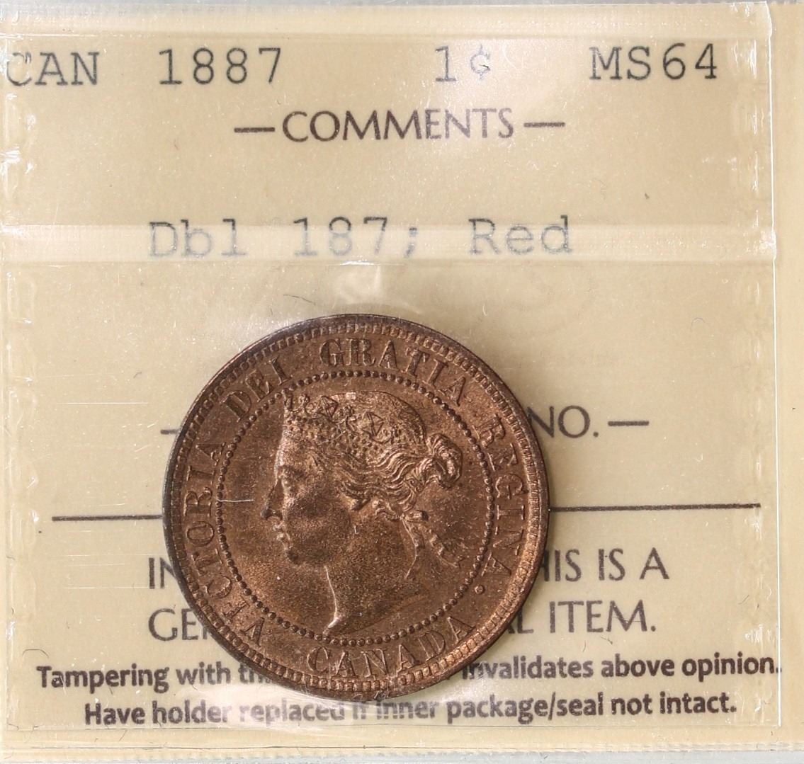 1887 1¢ "Dbl 187" ICCS Choice Mint State-64 Red 90% full red lustre. A flashy example.