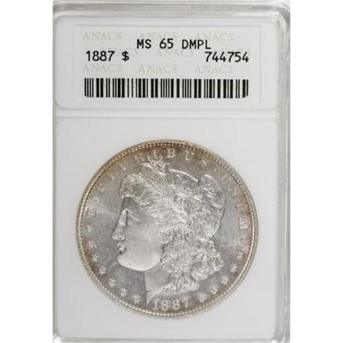 <B>1887 $1 MS65 Deep Mirror Prooflike ANACS.</B></I> NGC Census: (111/12). PCGS Population (164/30). Numismedia Wsl. Price for NGC/PCGS coin in MS65: $620. (#97173)<BR><BR><b>Shipping:</b> Coins & Currency (<a target="_blank" href="http://www.heritageauctions.com/common/shipping.php">view shipping information</a>)