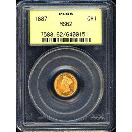 <b>1887 $1 Gold Indian. PCGS graded MS62.</b> Fiery orange gold toning leaps to the viewer's eye of nearly MS63 quality specimen in an early green tag PCGS holder <b>(PCGS # 7588)</b>