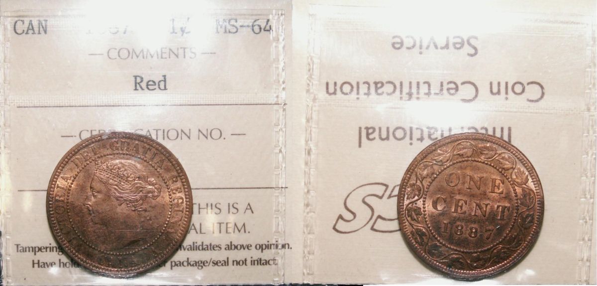 1887 1¢ ICCS MS64RD. A great example, 85% red with lots of lustre.