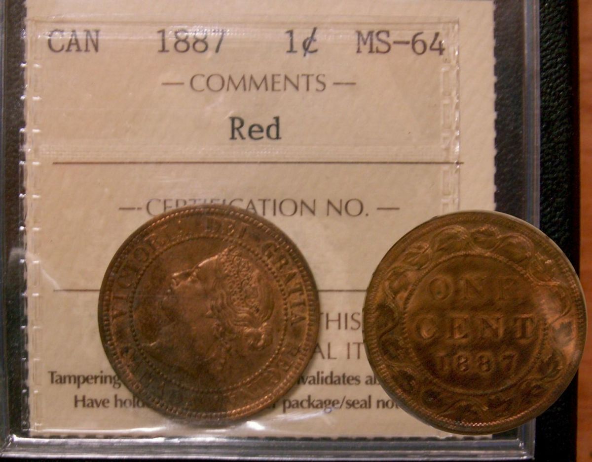 1887 1¢ ICCS MS64RD. A great example, 85% red with lots of lustre.