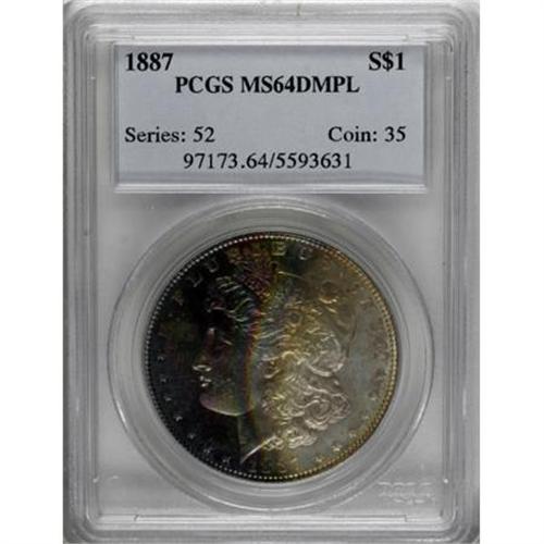 <B>1887 $1 MS64 Deep Mirror Prooflike PCGS.</B></I> The obverse shows fabulous bag toning in successive arcs of deep iridescent color. Fully struck and deeply mirrored in the fields, the reverse is bright and untoned.<BR><BR><b>Shipping:</b> Coins & Currency (<a target="_blank" href="http://www.heritageauctions.com/common/shipping.php">view shipping information</a>)